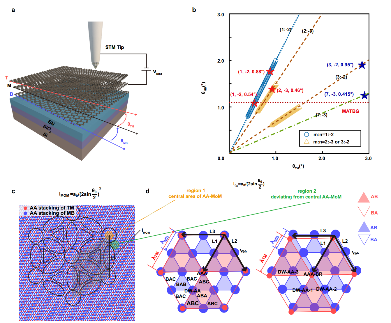 图1 | a,三层转角石墨烯样品的 STM 装置示意图。 b,在(θTM, θMB)比值为 (1, −2)、(2, −3) 和 (3, −2)下,理论得到的具有平带的魔转角。红星和蓝星代表该工作中的样品。c,(θTM, θMB)比值为(1,-2)的TTG 中超莫尔结构的示意图。黑色四边形代表超莫尔的单位元胞。圆圈代表超莫尔的AA区域,三角形代表 AB/BA区域,椭圆形代表 DW区域。d,(θTM, θMB)比值为(1,-2)的TTG中AA以及偏离AA区域的局域结构示意图。如图所示,C3z 旋转对称性在偏离AA区域处被破坏。